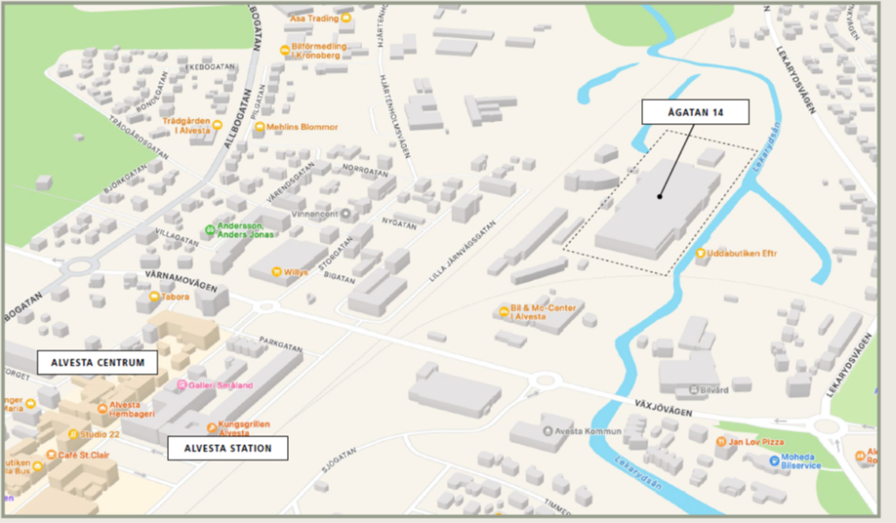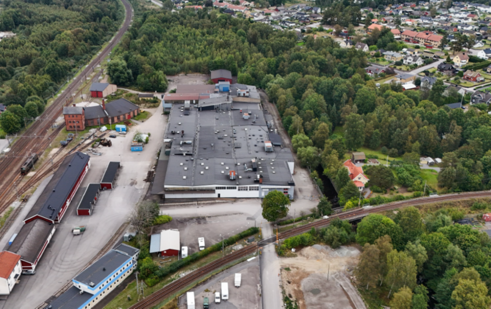 Fastigheten är belägen i ett industriområde mellan järnvägen (markområde ägt av